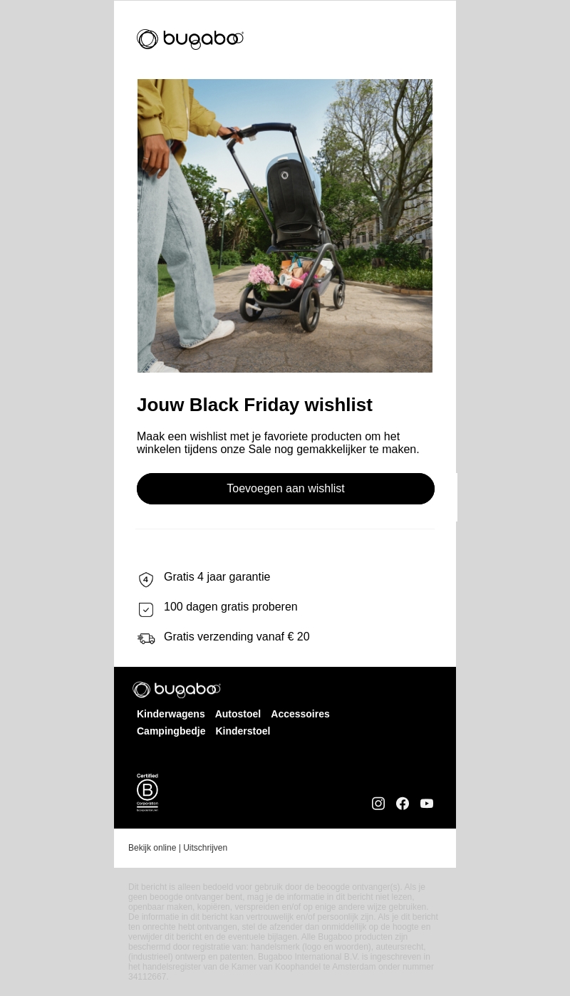 De Black Friday sale bij Bugaboo komt eraan en het is de perfecte tijd om je wishlist samen te stellen. Profiteer van gratis verzending vanaf € 20 en 100 dagen gratis proberen. Ontdek innovatieve kinderwagens, autostoelen en meer met 4 jaar garantie. Mis deze kans niet om je favoriete producten te bemachtigen met geweldige kortingen.