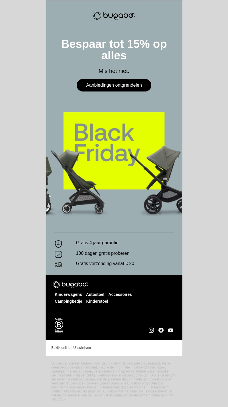 Ontdek de ultieme aanbiedingen van Bugaboo tijdens de Black Friday sale. Profiteer van 15% korting op alles, inclusief kinderwagens en autostoelen. Mis het niet en ontgrendel de aanbiedingen nu. Geniet van een gratis garantie van 4 jaar, 100 dagen gratis proberen en gratis verzending vanaf €20.