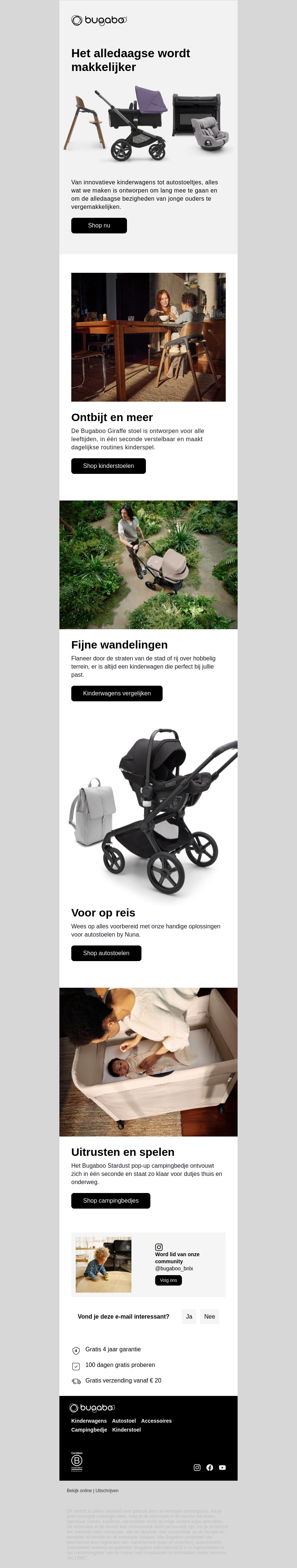 Bugaboo biedt een scala aan producten die het dagelijkse leven van jonge gezinnen eenvoudiger maken. Van kinderwagens geschikt voor elke omgeving, tot handige autostoelen en kinderstoelen voor aan tafel. Ontdek ook het gemak van onze campingbedjes voor onderweg. Profiteer van gratis verzending bij een bestelling vanaf €20.