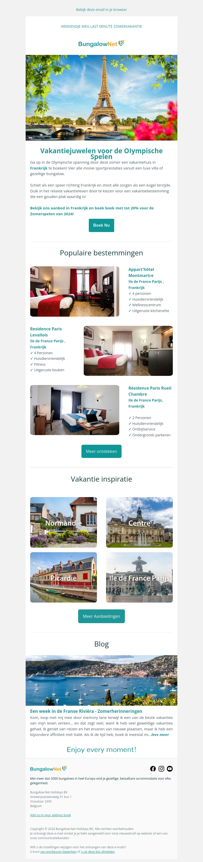 Ga op in de Olympische spanning met een vakantiehuis in Frankrijk. Ervaar mooie sportprestaties vanuit een luxe villa of gezellige bungalow. Ontvang tot 20% korting op jouw boeking. Ontdek populaire bestemmingen zoals Montmartre en Levallois en geniet van vakantie inspiratie uit Normandië, Centre, Picardië en Parijs. Boek nu en beleef prachtige zomerherinneringen.