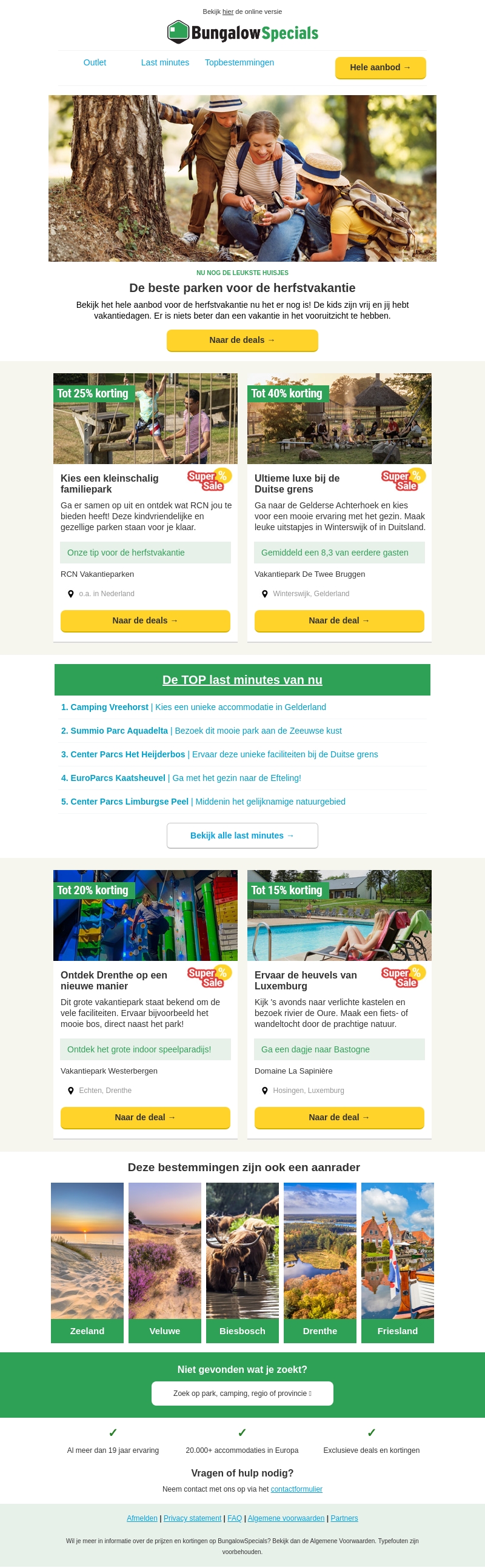 Ontdek de beste vakantieparken voor de herfstvakantie met kindvriendelijke en luxe opties. Bekijk de top last minutes en profiteer van kortingen tot wel 40%. Boek nu en geniet van een fantastische herfstvakantie met BungalowSpecials.