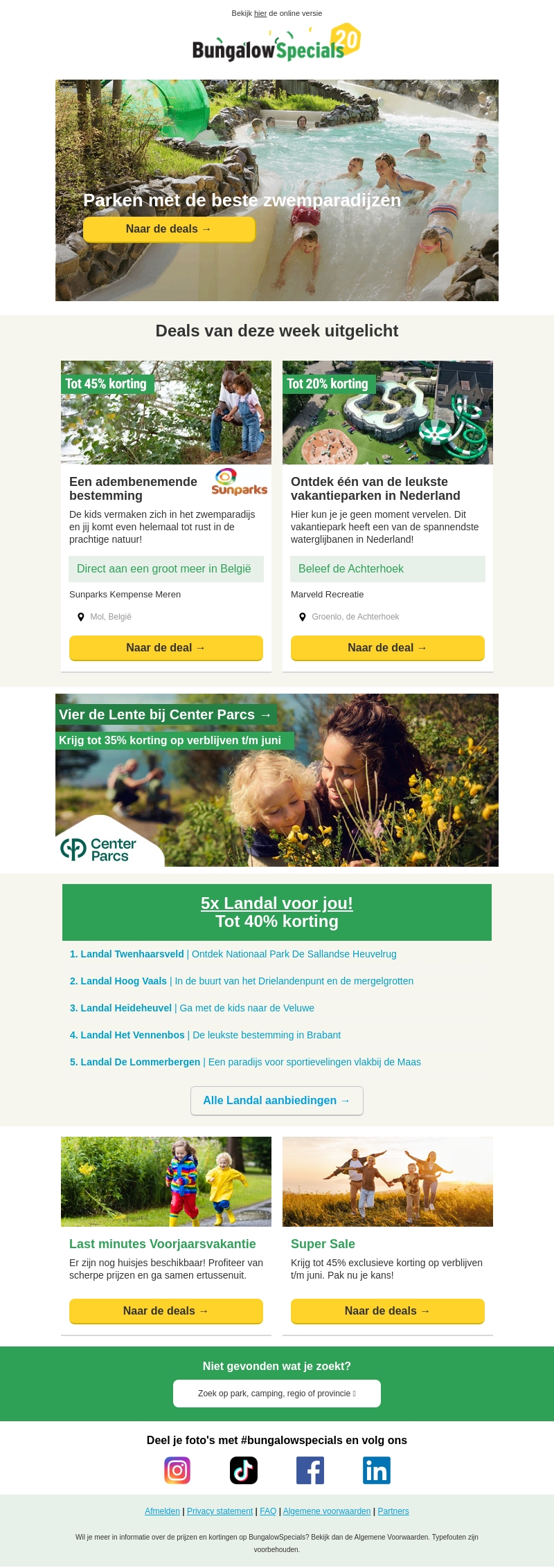 Deze nieuwsbrief van BungalowSpecials biedt exclusieve kortingen op verblijf in topvakantieparken met geweldige zwemparadijzen. Ontdek de rust en natuur in Belgisch Sunparks of beleef avontuur bij Marveld Recreatie in Nederland. Profiteer van kortingen bij Center Parcs en speciale aanbiedingen bij Landal parken. Boek nu en geniet van een voordelige voorjaarsvakantie!