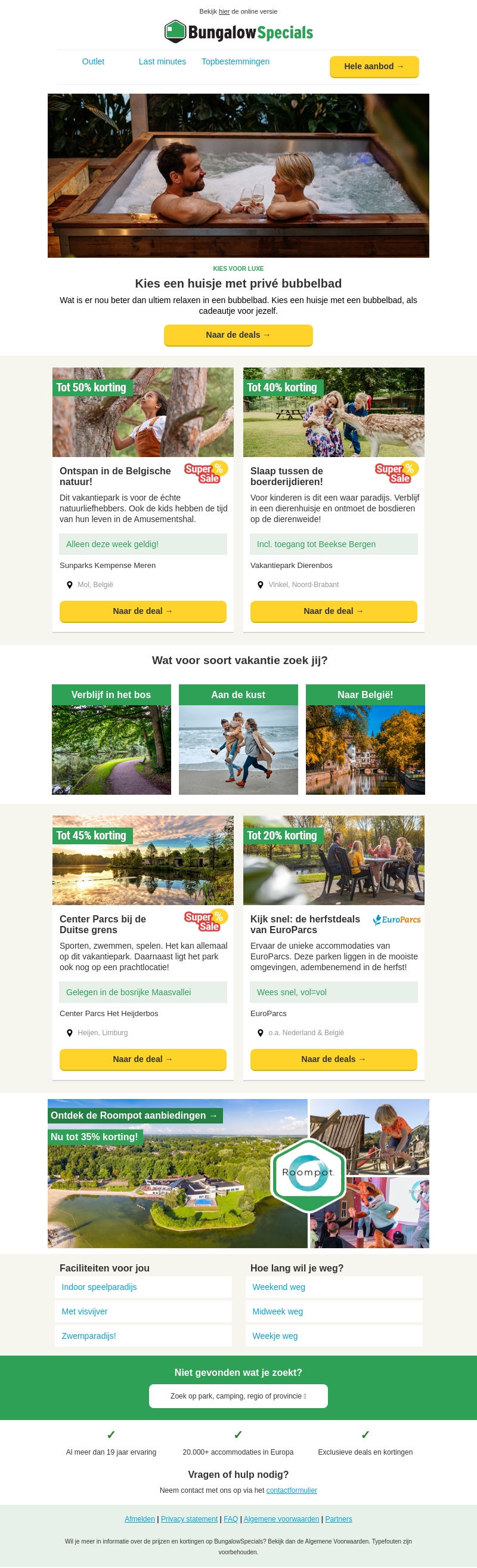 Wat is er leuker dan ontspannen in je eigen huisje met een privé bubbelbad? Kies een luxe bungalow en geniet van een heerlijk verblijf. Of je nu op zoek bent naar rust midden in de natuur of een avontuurlijk vakantiepark wilt ontdekken, BungalowSpecials biedt diverse mogelijkheden. Ontdek de aanbiedingen en boek jouw droomverblijf!