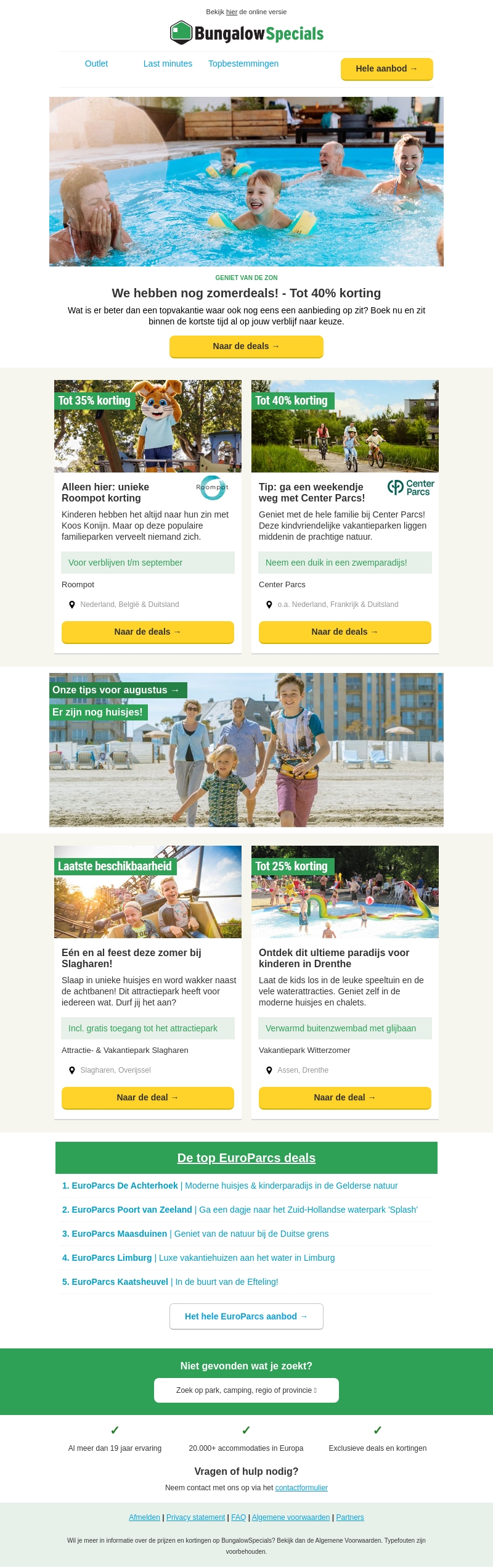 Profiteer van onze zomerdeals met kortingen tot 40%! Of je nu een weekendje weg wilt met Center Parcs, unieke avonturen wilt beleven in Slagharen, of een paradijs voor kinderen zoekt in Drenthe - we hebben geweldige aanbiedingen. Boek nu en geniet van een onvergetelijke vakantie met het hele gezin!