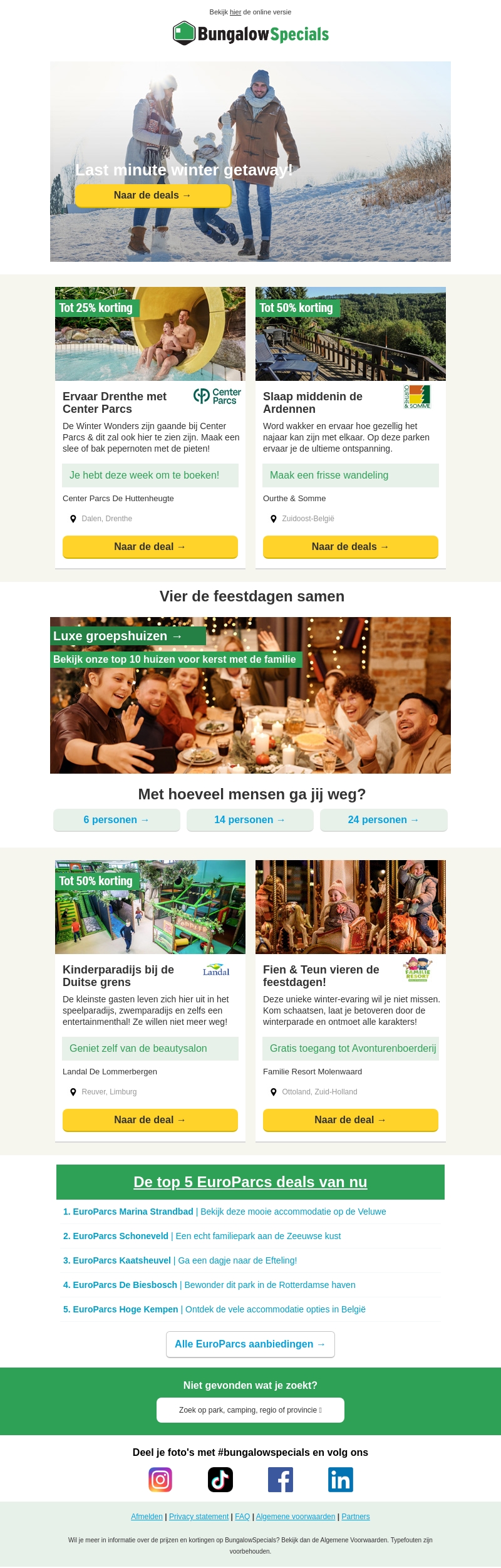 Ontdek de nieuwste winterdeals met BungalowSpecials voor een perfecte wintervakantie. Geniet van kortingen tot 50% bij Center Parcs en unieke ervaringen in de Ardennen. Verblijf in luxe groepshuizen voor de feestdagen of bezoek kinderparadijzen met de kleintjes. Bekijk onze top 5 EuroParcs deals en vind de beste accommodatie voor jouw gezin.