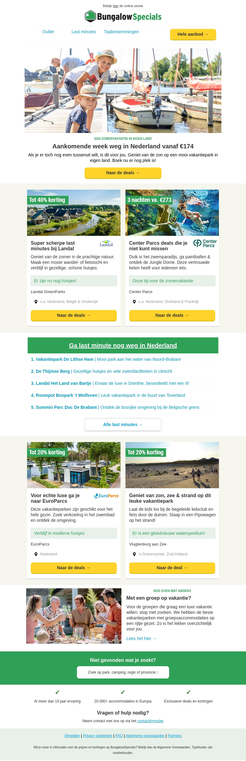 Ga deze week nog weg in Nederland vanaf slechts €174! Ontdek geweldige deals bij vakantieparken zoals Landal, Center Parcs en EuroParcs. Geniet van zonnige dagen, prachtige natuur en allerlei activiteiten voor het hele gezin. Mis het niet en boek vandaag nog je zomervakantie!