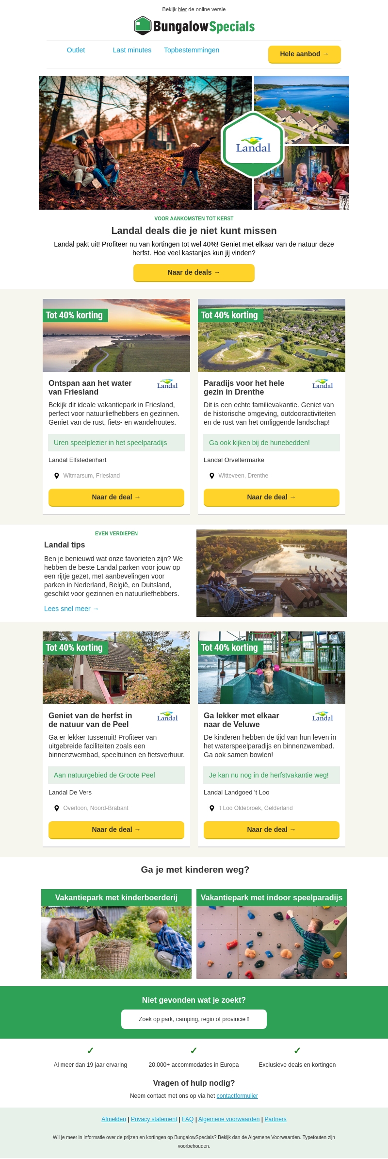Landal biedt fantastische kortingen tot wel 40% op gezinsuitjes. Profiteer van rustgevende accommodaties in Friesland, Drenthe, en meer. Geniet van binnen- en buitenactiviteiten, perfect voor de herfstvakantie. Ontdek de beste Landal parken voor je volgende avontuur.