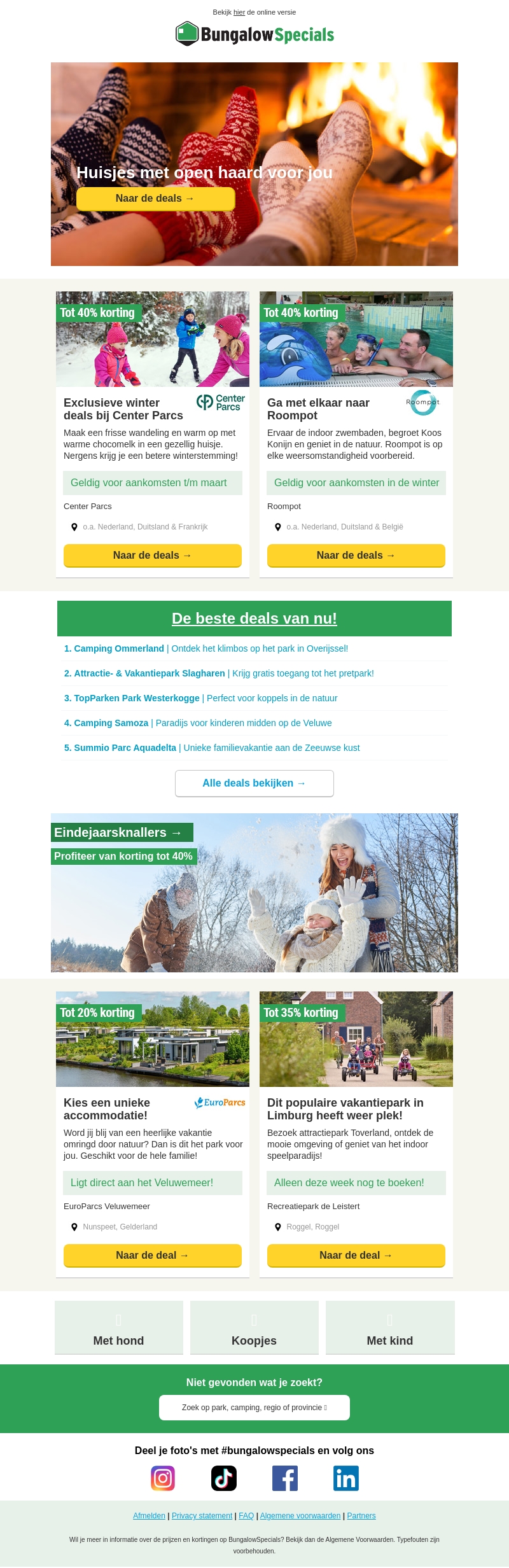 Profiteer van exclusieve winterdeals bij Center Parcs en Roompot met tot 40% korting. Geniet van gezellige huisjes met haard aan onder meer Zwembadfun en prachtige natuur. Ontvang ook eindejaarsknallers bij EuroParcs en Recreatiepark de Leistert.