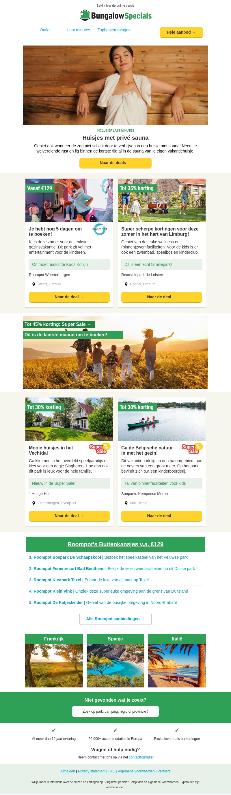 Geniet van ultieme ontspanning in een huisje met priv� sauna. Perfect voor een verblijf tijdens de zomervakantie, of de laatste maand om te boeken met tot 45% korting. Of kies voor een avontuurlijke vakantie met het gezin in Limburg of Overijssel met topkortingen. Ontdek de beste aanbiedingen.