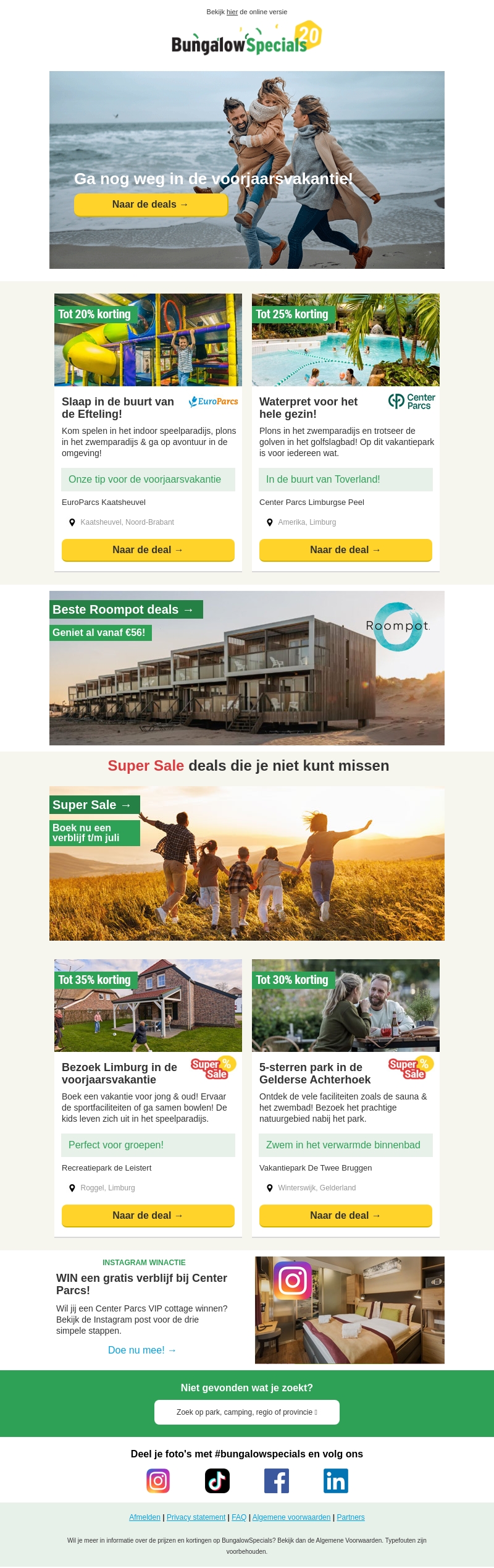Plan je voorjaarsvakantie met geweldige deals op bungalows! Van waterparken tot dicht bij de natuur, er is voor ieder wat wils. Profiteer van kortingen tot 35% en geniet van een onvergetelijke vakantie met het gezin. Mis de Super Sale niet voor extra voordelen!
