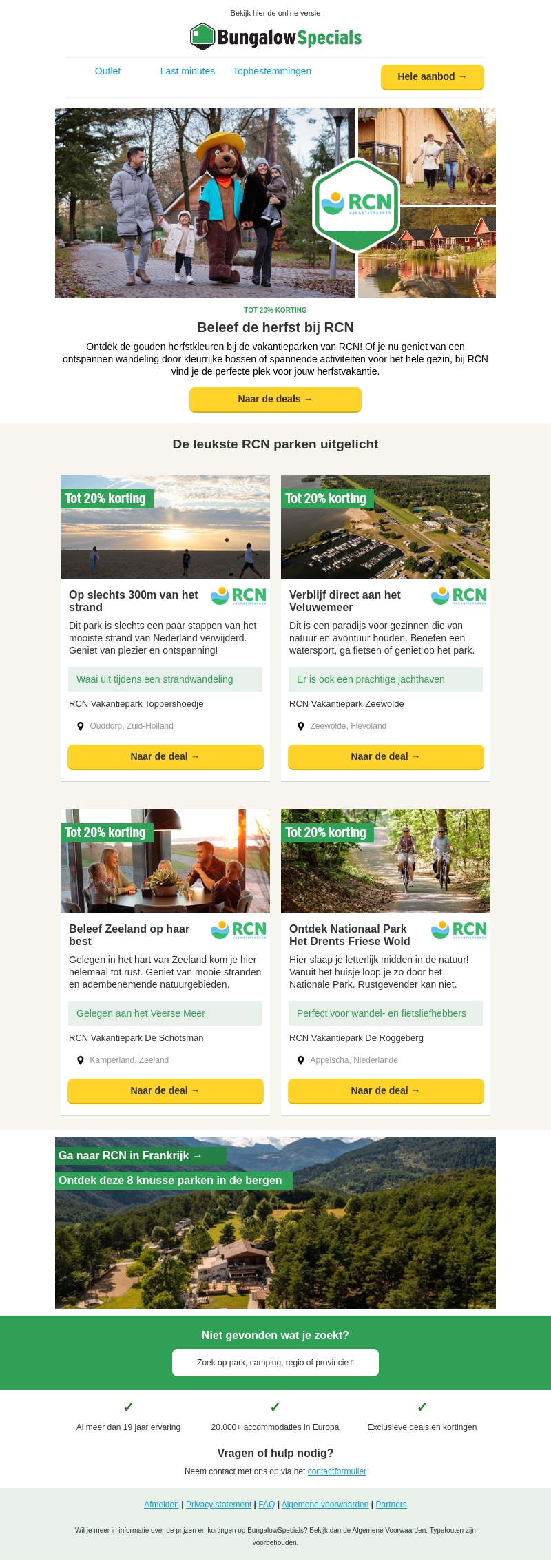 Ontdek de gouden herfstkleuren bij de vakantieparken van RCN! Geniet van een ontspannen wandeling door kleurrijke bossen of spannende activiteiten voor het hele gezin. Met een korting tot 20% vind je bij RCN de perfecte plek voor jouw herfstvakantie.