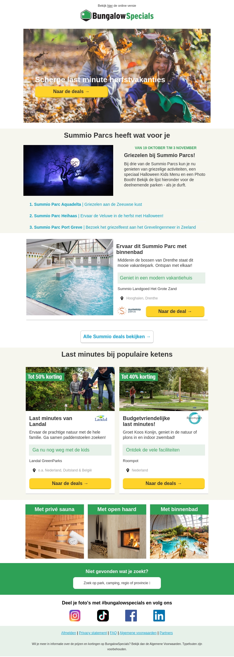 Mis deze unieke kans niet voor een onvergetelijke herfstvakantie met BungalowSpecials. Van spannende Halloween evenementen bij Summio Parcs tot budgetvriendelijke opties bij Roompot en Landal GreenParks. Profiteer nu van kortingen tot wel 50% op diverse parken. Bezoek prachtige bestemmingen in Nederland, Duitsland en Belgiรซ, en geniet van faciliteiten zoals privรฉ sauna's, open haarden en binnenbaden.