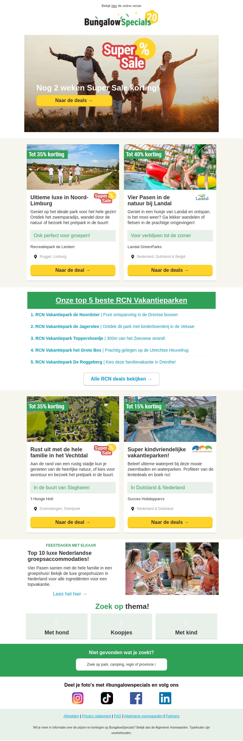 Nog maar 2 weken tot wel 40% korting bij BungalowSpecials. Geniet van luxe in Limburg of vier Pasen in de natuur met geweldige deals. Ontdek ook de top 5 RCN Vakantieparken met speciale aanbiedingen. Boek nu voor een voordelige vakantie met de hele familie.