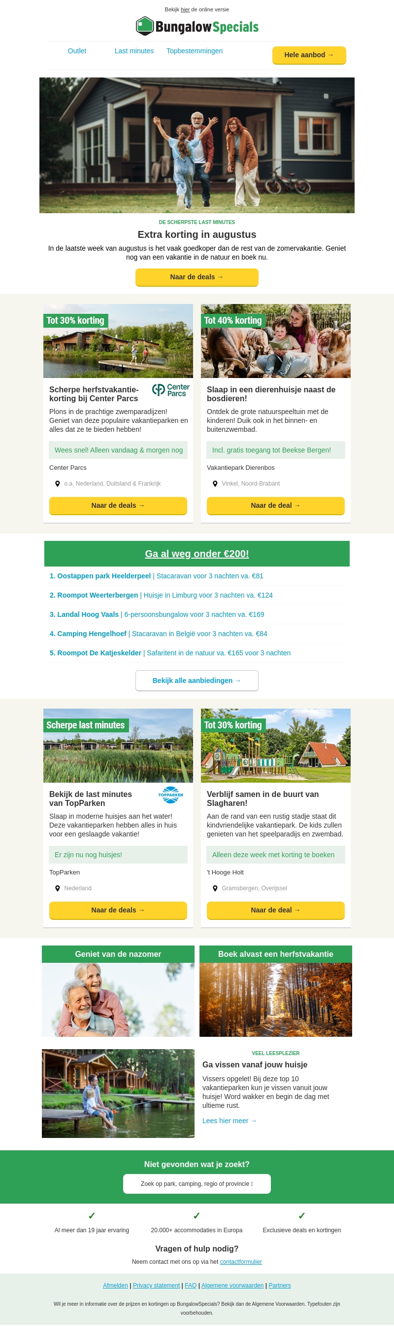 Augustus is de maand van extra kortingen bij BungalowSpecials! Geniet van de scherpste last-minute deals in populaire vakantieparken in Nederland, Duitsland, en Frankrijk. Beleef een geweldige tijd met je gezin in de natuur. Boek snel en betaal minder voor je vakantie.
