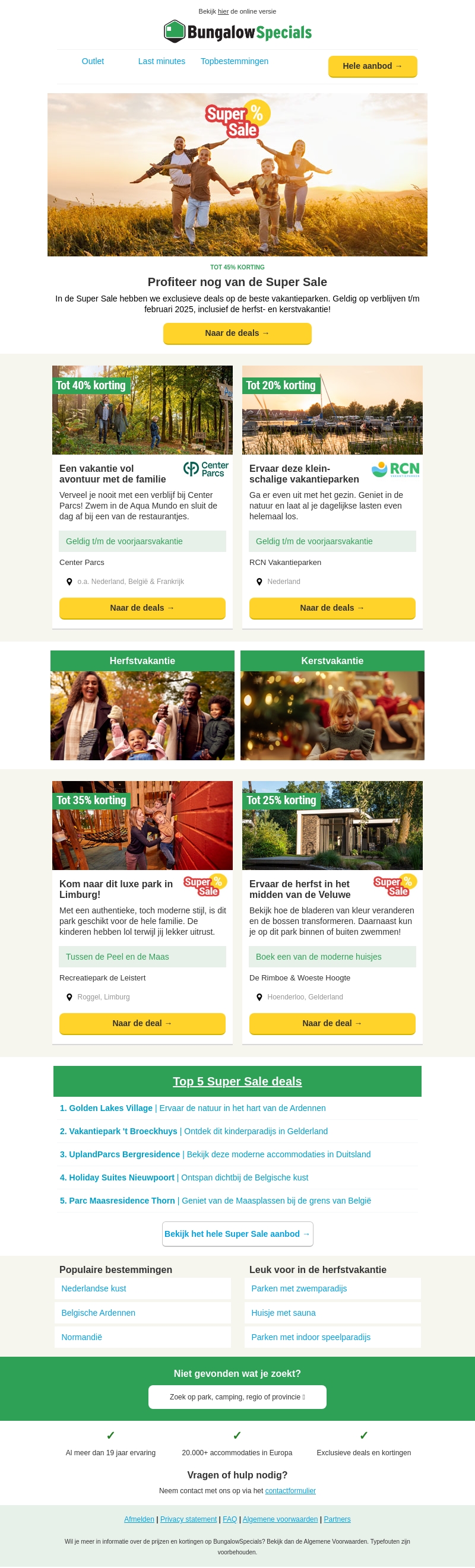 Beleef een fantastische vakantie met onze Super Sale! Ontvang tot 45% korting op verblijf in top vakantieparken, geldig t/m februari 2025. Of je nu op zoek bent naar avontuur, rust, of gezinsvriendelijke locaties, we hebben voor ieder wat wils. Grijp deze kans en boek nu je ideale vakantie.