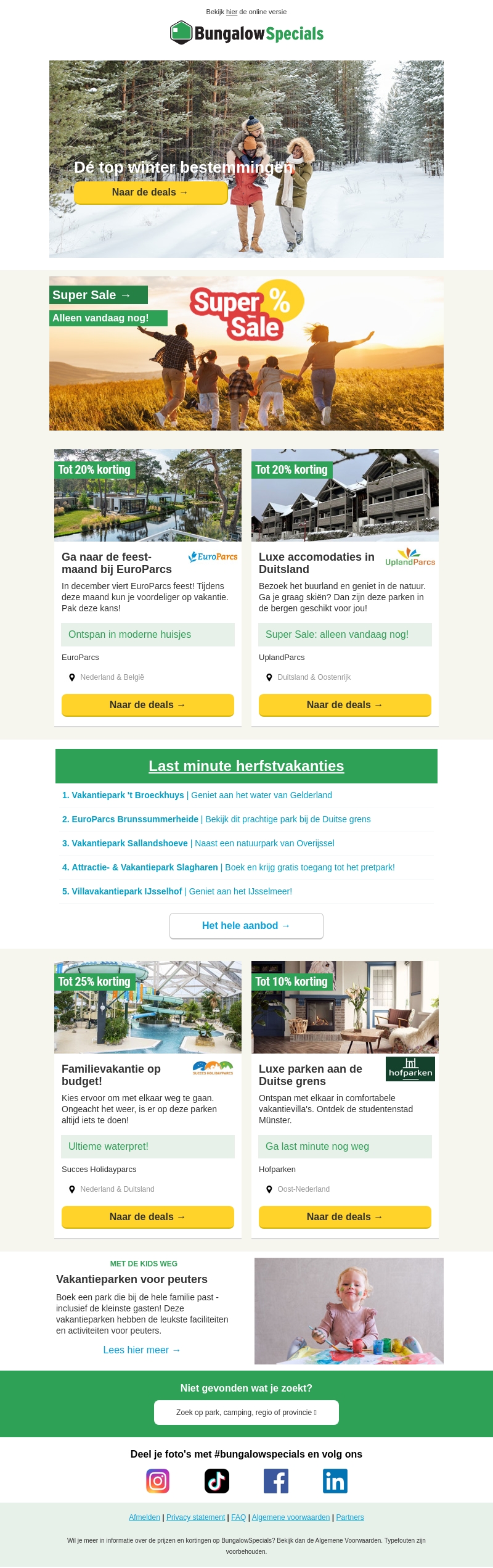 Bekijk de top winterbestemmingen en geniet van speciale kortingen tot 20% bij BungalowSpecials. Ontspan in moderne vakantiehuizen bij EuroParcs of ervaar luxe accommodaties in Duitsland met UplandParcs. Voor gezinnen zijn er budgetvriendelijke opties met kortingen tot 25% bij Succes Holidayparcs. Boek vandaag nog jouw perfecte wintervakantie!