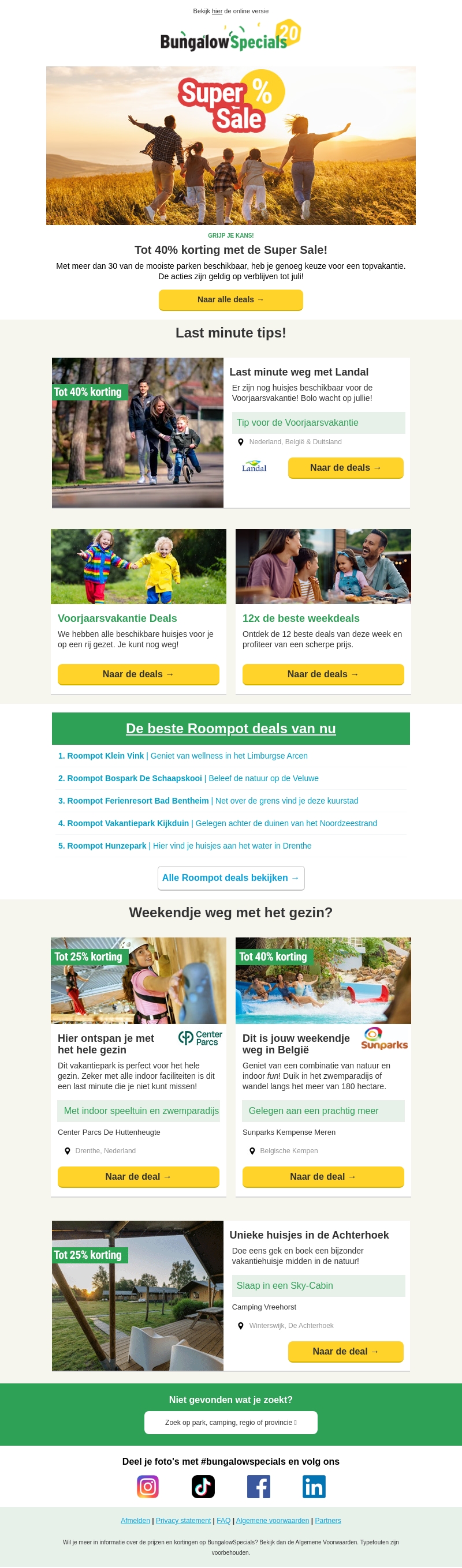 Mis je kans niet tijdens de Super Sale met tot 40% korting op verblijven. Kies uit meer dan 30 parken en geniet van een topvakantie. Profiteer van last-minute tips en speciale weekendaanbiedingen om je verblijf nog leuker te maken.