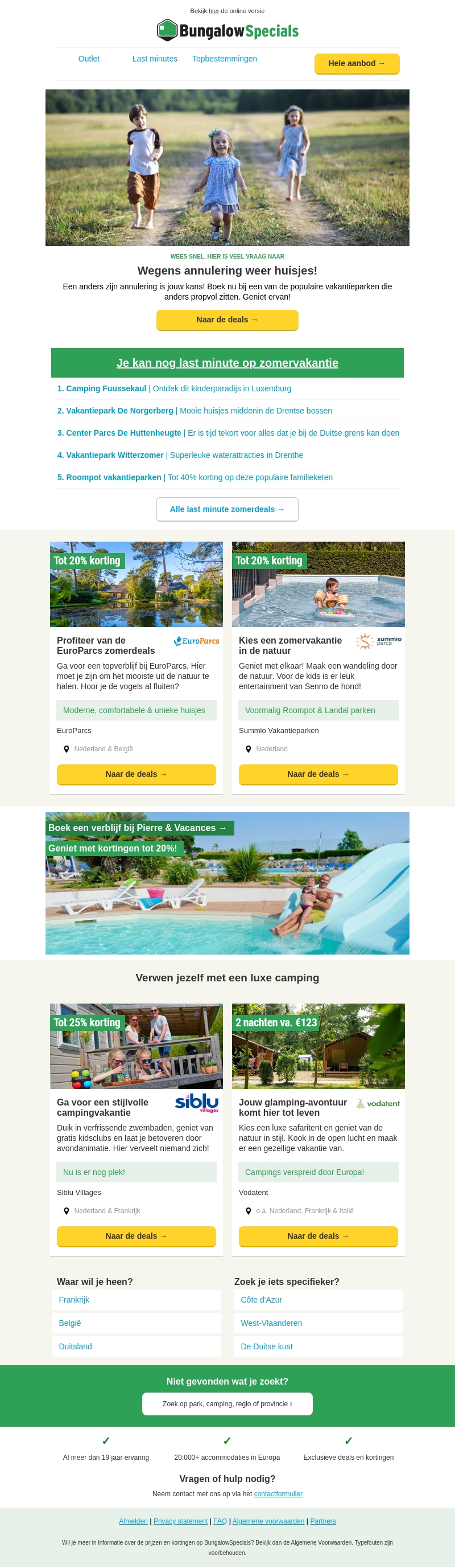 Door een annulering zijn er weer huisjes vrij! Dit is je kans om te boeken bij populaire vakantieparken die normaal vol zitten. Ontdek last minute zomervakanties met speciale deals, tot 40% korting bij verschillende vakantieparken. Wees er snel bij, want deze aanbiedingen zijn beperkt.