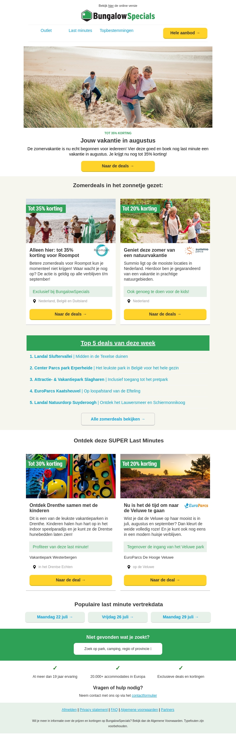 De zomervakantie is begonnen en dat betekent geweldige aanbiedingen bij BungalowSpecials! Ontvang tot 35% korting op jouw verblijf in augustus. Kies een van onze topdeals en geniet van een welverdiende vakantie.