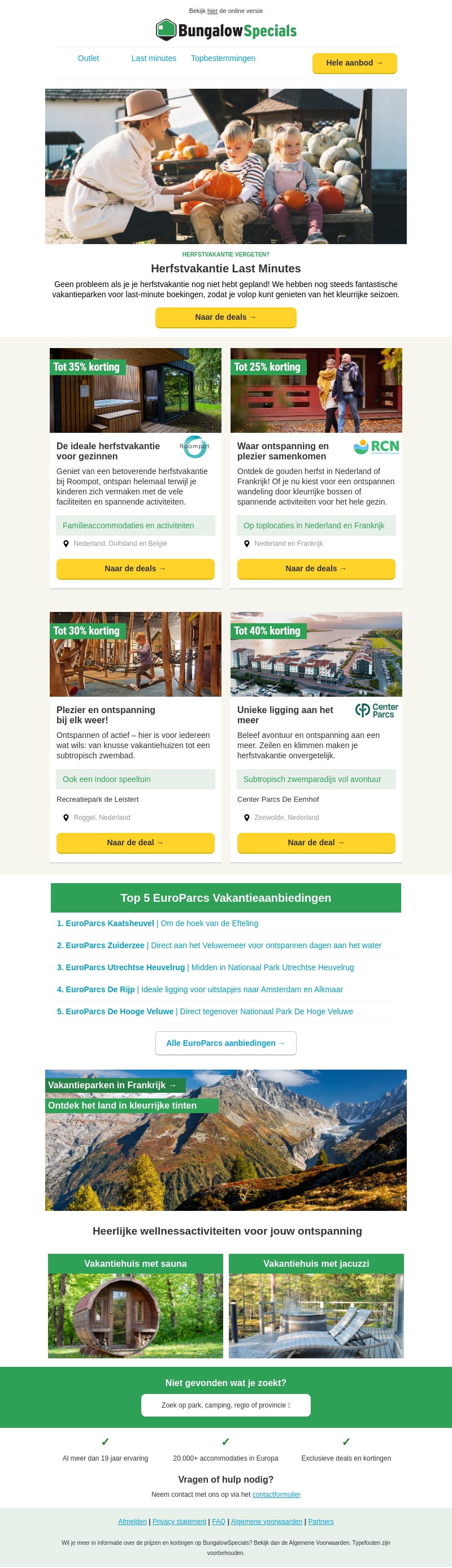 Plan spontaan je herfstvakantie met de beste last-minute deals van BungalowSpecials. Geniet van tot wel 40% korting op familievriendelijke accommodaties. Ontdek de prachtige herfstkleuren in Nederland, Duitsland, België en Frankrijk. Verwen jezelf met welzijnsactiviteiten zoals sauna en jacuzzi. Mis deze kans niet om te ontspannen en samen te komen met je gezin.
