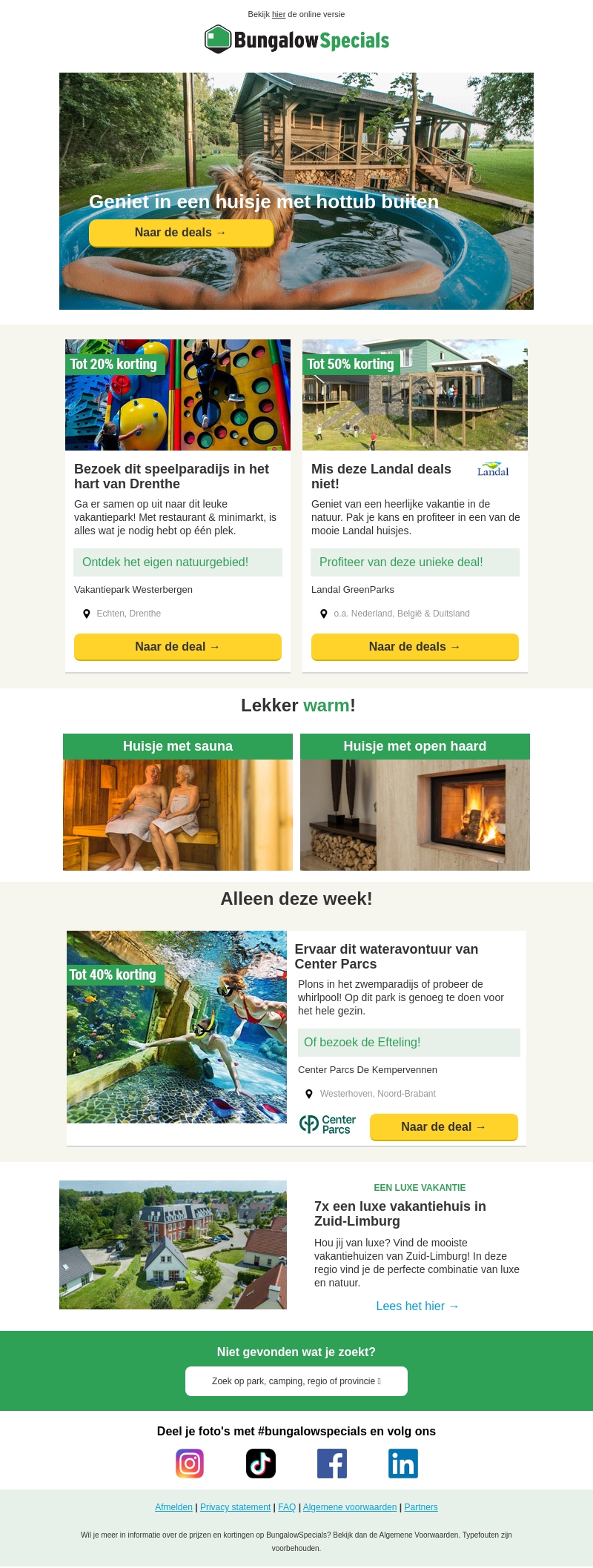 Beleef een ontspannen vakantie in een van onze huisjes met bubbelbad en profiteer van kortingen tot 20%. Geniet van zwembaden en unieke vakantieparken in Drenthe, Limburg en meer. Of je nu wilt ontspannen voor een open haard of wilt genieten van een sauna, er is voor ieder wat wils. Tijdelijke aanbiedingen bij BungalowSpecials maken het mogelijk om de beste deals te ontdekken.