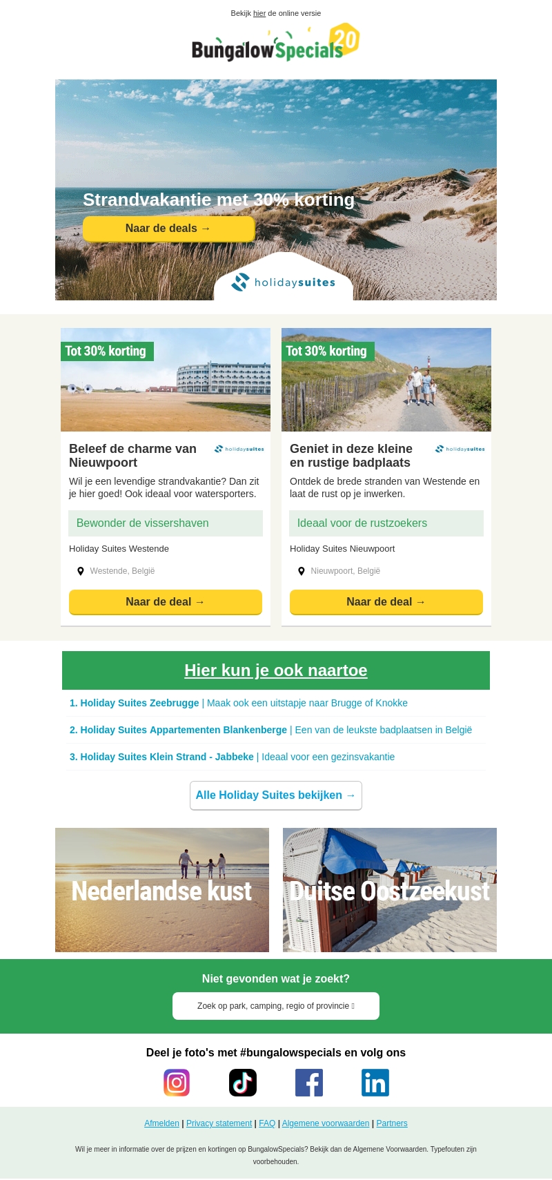Beleef een onvergetelijke strandvakantie aan de Belgische kust met kortingen tot 30% bij Holiday Suites. Geniet van de levendige sfeer van Nieuwpoort of vind rust aan de stranden van Westende. Maak uitstapjes naar Brugge of Knokke en ontdek het beste van België. Ideaal voor liefhebbers van watersporten en rustzoekers.