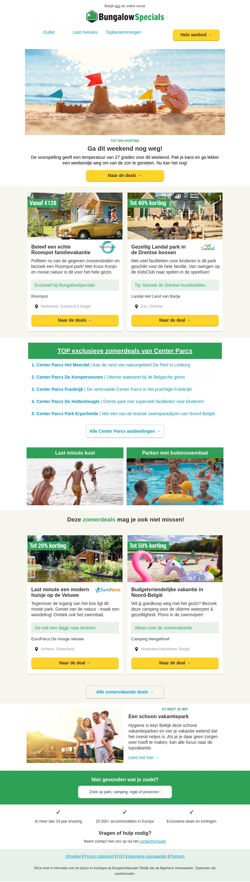 De voorspelling is 27 graden voor dit weekend. Grijp deze kans en boek je weekendje weg om te ontspannen en te genieten van de zon. Ontvang tot 35% korting op geselecteerde bestemmingen. Bekijk onze aanbiedingen en plan je uitje nu!