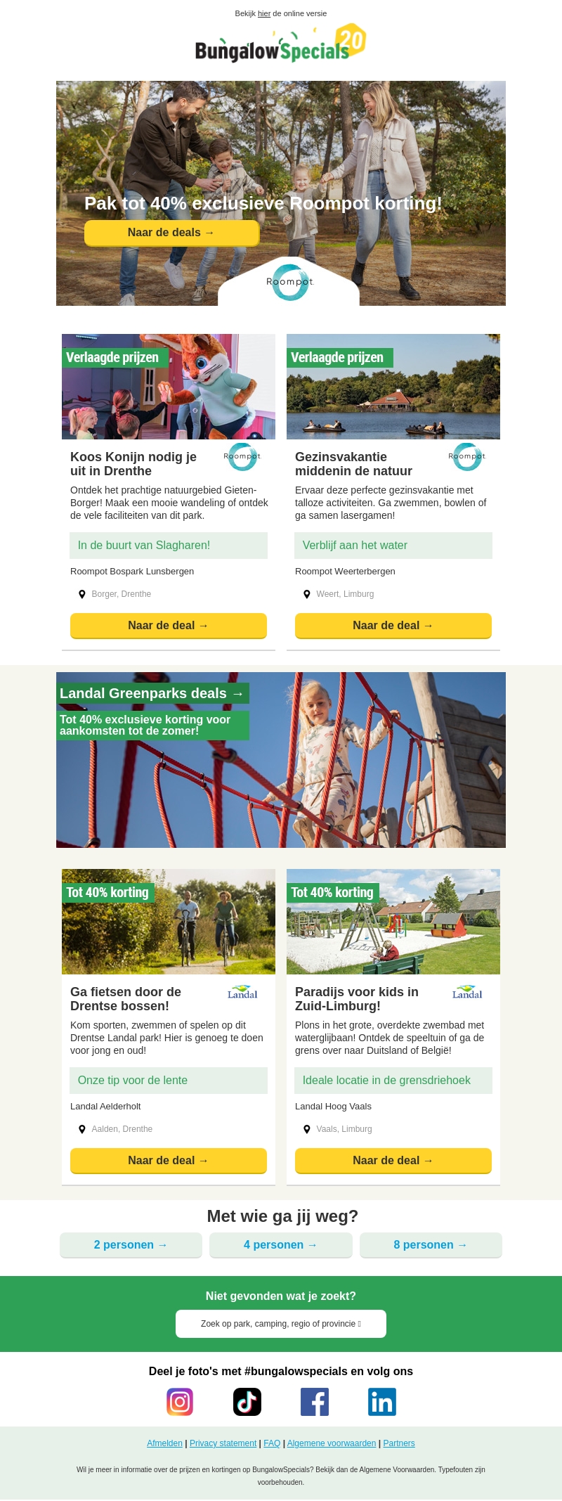Geniet van exclusieve kortingen tot 40% bij Roompot en Landal Greenparks. Ontdek prachtige natuurgebieden, ga fietsen door Drentse bossen, of kies voor een gezinsvakantie midden in de natuur. Er zijn tal van activiteiten voor jong en oud. Plan je volgende avontuur nu en bespaar op je verblijf.