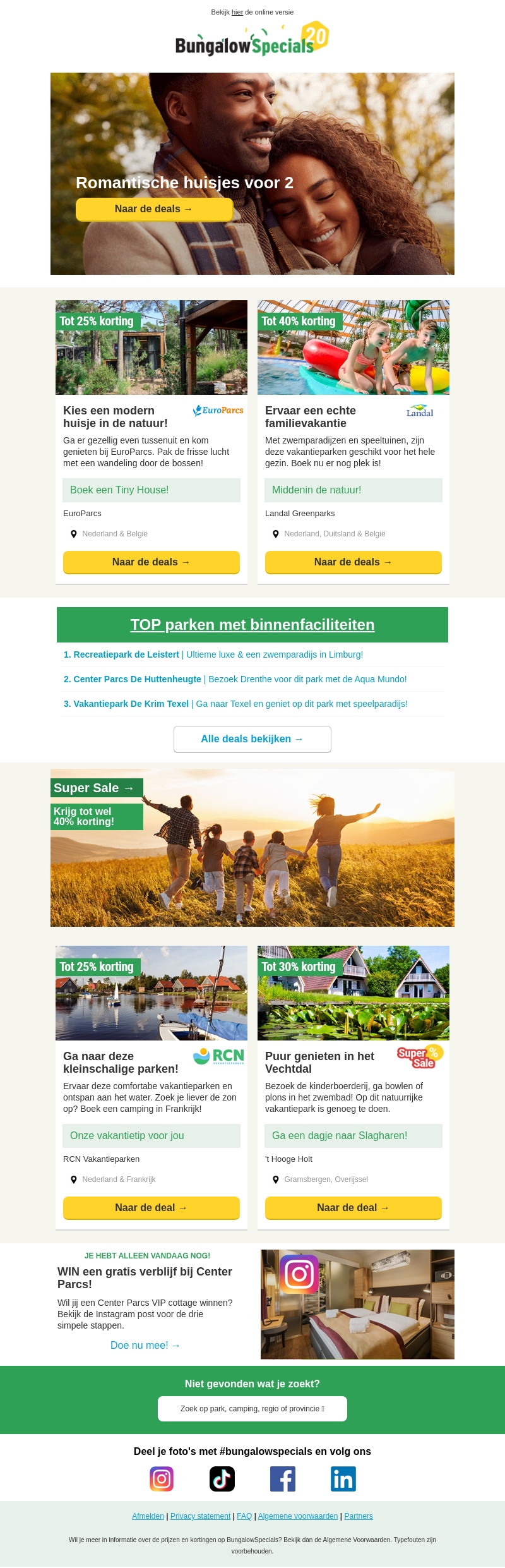 Vier Valentijnsdag op een originele manier met BungalowSpecials! Geniet van romantische huisjes voor twee of ervaar een gezellige familievakantie. Ontvang tot 40% korting op diverse vakantieparken in Nederland, België en Duitsland. Of je nu kiest voor een moderne tiny house of een vakantie met binnenfaciliteiten, wij hebben de perfecte deal voor jou. Profiteer nu van deze speciale aanbiedingen en win bovendien een gratis verblijf bij Center Parcs.