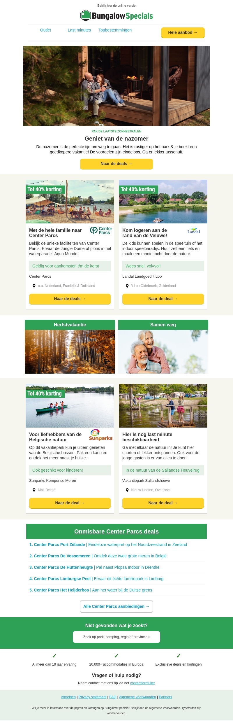 Pak de laatste zonnestralen met onze geweldige nazomeraanbiedingen. Geniet van de rust op het park en boek een voordelige vakantie. Ontdek unieke faciliteiten en mooie accommodaties met kortingen tot 40%.