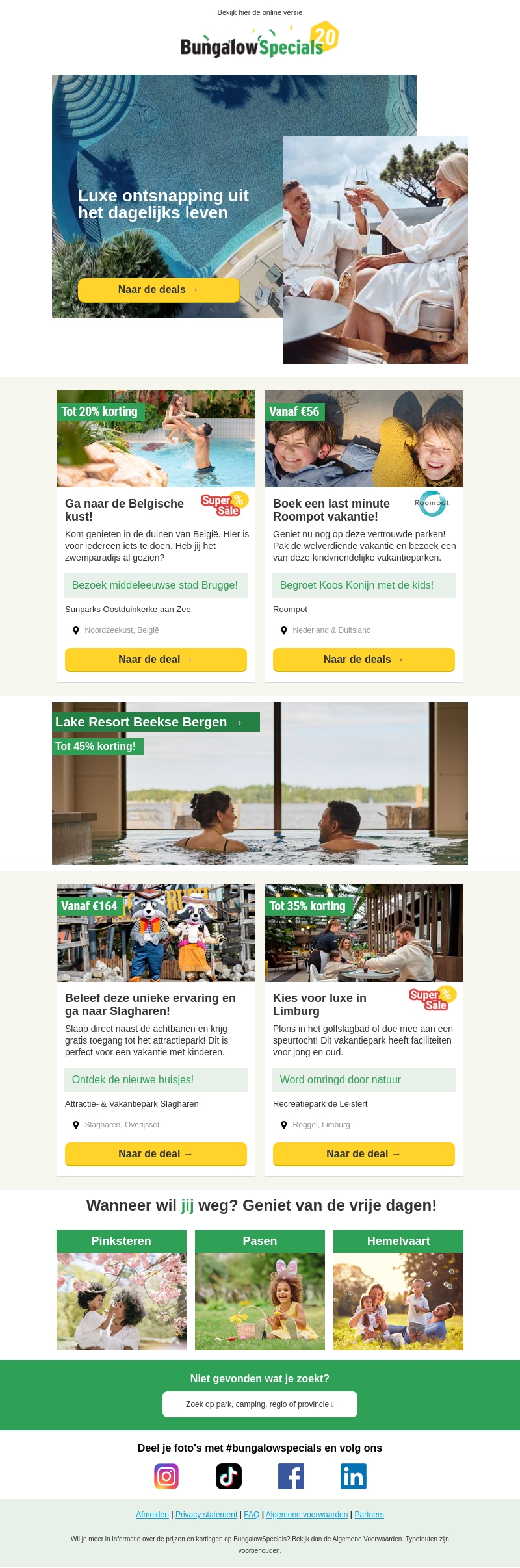 Verwen jezelf met een luxe vakantie bij BungalowSpecials. Profiteer van tot 45% korting op verblijven aan de Belgische kust, Lake Resort Beekse Bergen en meer. Boek snel een last-minute vakantie bij Roompot of geniet van unieke ervaringen in Slagharen.