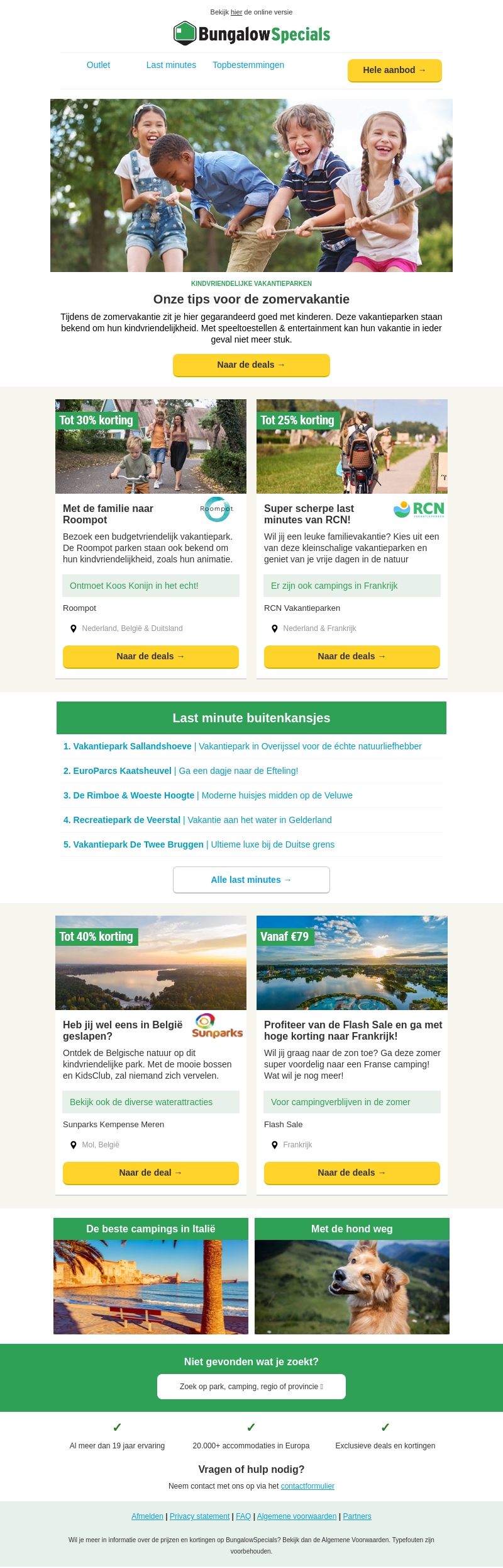 Bekijk de nieuwste tips voor een heerlijke zomervakantie met kinderen. Maak gebruik van unieke kortingen en last minute aanbiedingen voor de mooiste vakantieparken. Mis deze kans niet om een onvergetelijke vakantie te beleven.
