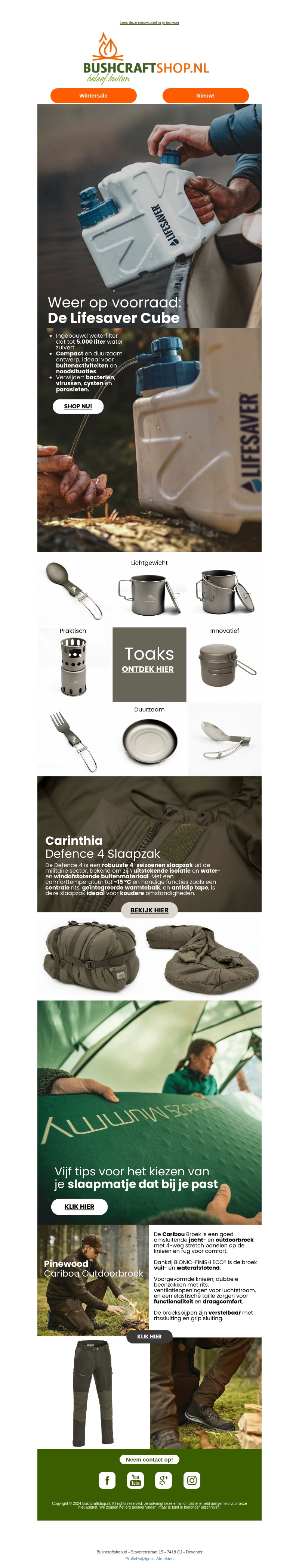 Bereid je voor op je volgende avontuur met onze nieuwste producten. Van de innovatieve Lifesaver Cube tot de robuuste Carinthia Defence 4 slaapzak, we hebben alles wat je nodig hebt. Daarnaast geven we handige tips voor het kiezen van het perfecte slaapmatje. Mis ook onze Pinewood Caribou outdoorbroek niet voor ultiem comfort.