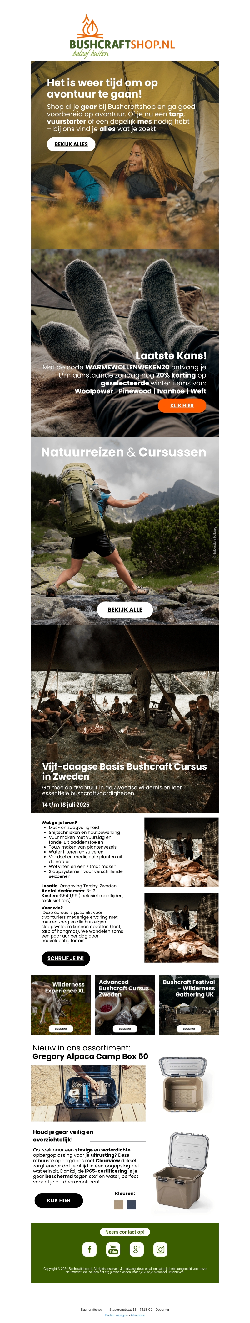 BushcraftShop.nl biedt je de kans om met 20% korting je winteruitrusting compleet te maken. Of je nu op zoek bent naar warme kleding of handige bushcraft gear, deze nieuwsbrief heeft het allemaal. Mis de laatste kans niet om te profiteren van de korting op geselecteerde items. Bereid je voor op de winteravonturen met essentials van topmerken. Bovendien zijn er spannende cursussen en nieuwe producten beschikbaar. Bekijk alles snel voor de actie verloopt!