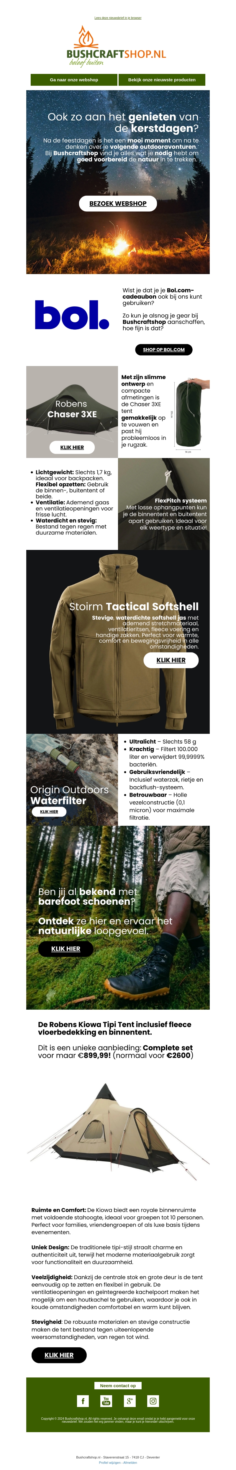Ervaar de schoonheid van de feestdagen met bijzondere aanbiedingen van BushcraftShop. Van lichtgewicht tenten tot tactische softshell jassen, bereid je voor op je volgende avontuur. Mis de unieke deals niet en geniet van de kerstdagen in stijl en comfort.