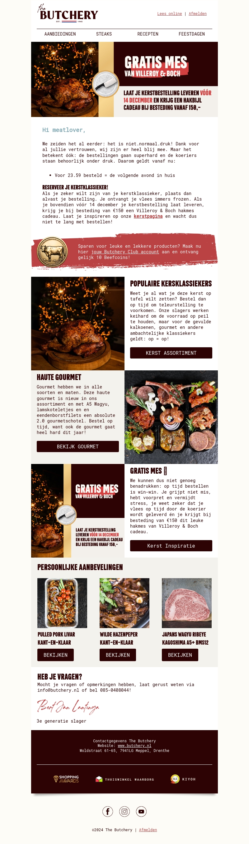 Bestel je kerstklassiekers op tijd en ontvang een gratis Villeroy & Boch mes bij besteding van 150 euro. Geniet van populaire gerechten zoals gevulde kalkoenen en haute gourmet. Reserveer je vlees en vermijd teleurstellingen tijdens de feestdagen!