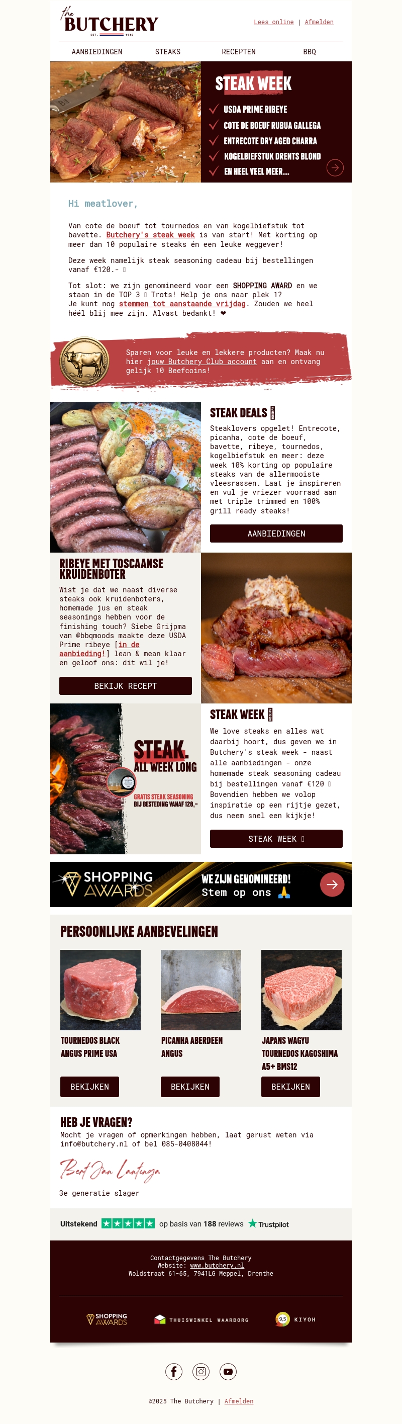 De Steak Week is begonnen bij Butchery! Profiteer van kortingen op meer dan 10 populaire steaks. Bestel nu en ontvang gratis steak seasoning bij aankopen vanaf €120. Help ons ook winnen bij de Shopping Awards! Stemmen kan tot aanstaande vrijdag.