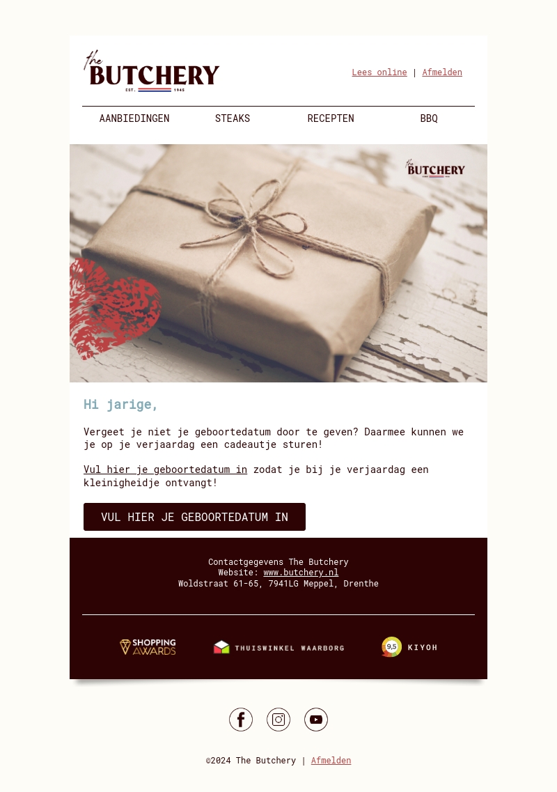 Vergeet je geboortedatum niet door te geven aan The Butchery. Zo kunnen ze je een speciaal cadeautje sturen voor je verjaardag. Vul je gegevens in en ontvang een klein gebaar op je speciale dag. Bekijk de details in de nieuwsbrief en geniet van je verrassingscadeau!