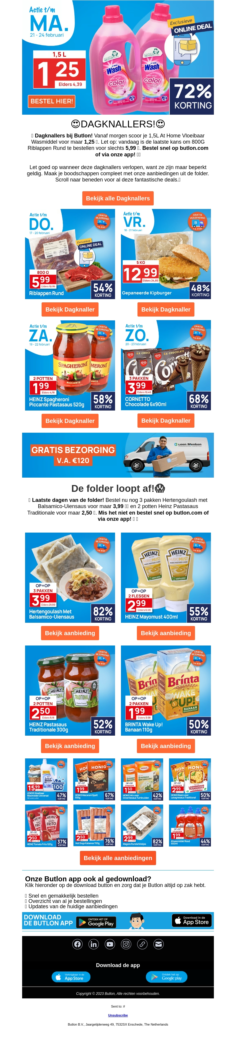 Profiteer van onze spectaculaire dagknallers bij Butlon! Grijp je kans om 1,5L At Home Vloeibaar Wasmiddel te scoren voor slechts €1,25. Deze exclusieve online deal is beschikbaar tot en met 24 februari. Ontdek ook kortingen op riblappen, kipburgers en veel meer. Vergeet niet de Butlon app te downloaden voor snelle en gemakkelijke bestellingen.