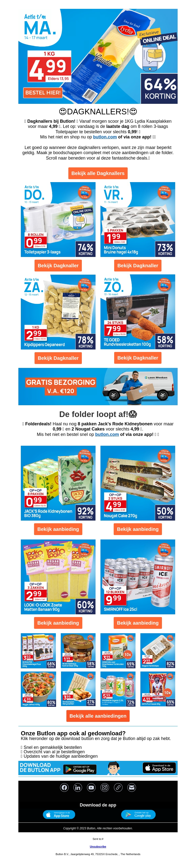 Grijp je kans met deze ongelofelijke aanbieding van de week! Bij Button krijg je nu 1KG heerlijke kaasplakken voor slechts €4,99, een geweldige besparing van 64%. Wees snel, want deze dagknaller is beperkt beschikbaar. Mis deze kans niet om jouw voorraad aan te vullen met nog meer geweldige deals in onze folder. Plaats je bestelling eenvoudig via onze website of app.