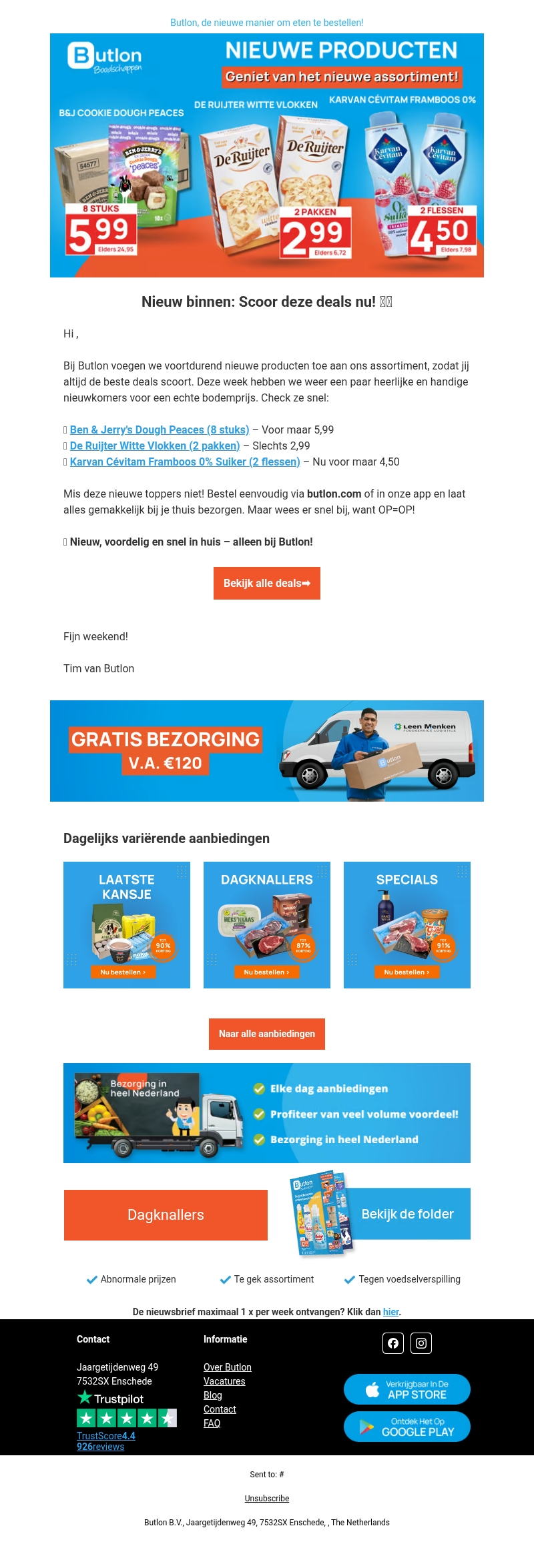 Deze week presenteert Butlon een uitstekende selectie van nieuwe producten tegen onverslaanbare prijzen. Geniet van Ben & Jerry's Dough Peaces voor slechts 5,99. De Ruijter Witte Vlokken zijn beschikbaar voor 2,99, en Karvan Cévitam Framboos 0% Suiker voor 4,50. Mis deze fantastische deals niet en bestel ze eenvoudig via onze website of app. Vergeet niet dat de voorraad beperkt is, dus wees er snel bij!