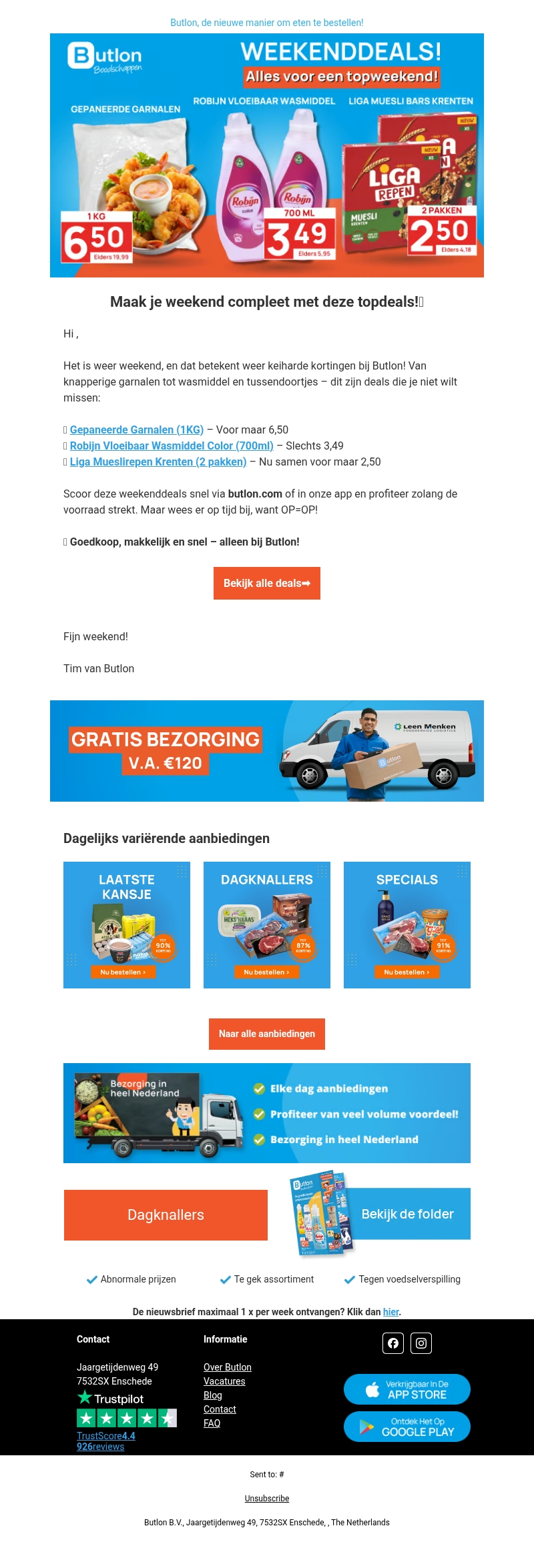 Beleef een topweekend met de fantastische deals van Butlon! Ontvang grote kortingen op gepaneerde garnalen, Robijn vloeibaar wasmiddel en Liga mueslirepen. Mis deze kans niet en scoor snel je favoriete producten zolang de voorraad strekt. Geniet van goedkoop, makkelijk en snel winkelen, alleen bij Butlon!