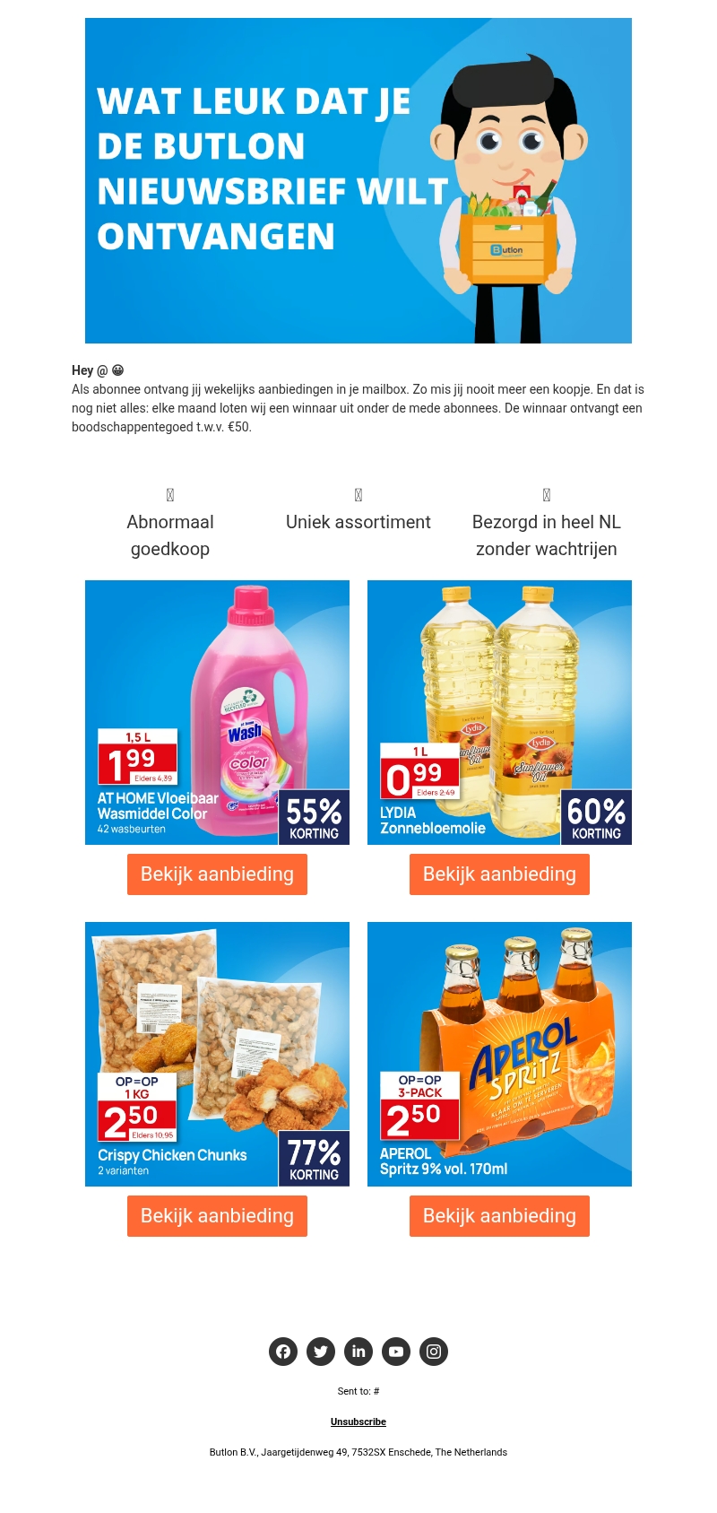 Welkom bij de Butlon nieuwsbrief! Ontdek wekelijks unieke aanbiedingen die je niet wilt missen, waaronder geweldige kortingen op dagelijkse producten. Als abonnee maak je bovendien elke maand kans op een boodschappen tegoed van €50. Blijf op de hoogte en profiteer van de beste deals direct in je inbox.