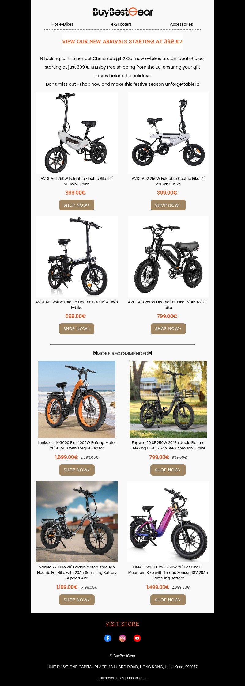 Zoek je een perfect kerstcadeau? Onze nieuwe e-bikes zijn nu beschikbaar vanaf slechts €399. Geniet van gratis verzending vanuit de EU zodat je cadeau op tijd is. Mis deze kans niet—shop nu en maak de feestdagen onvergetelijk!