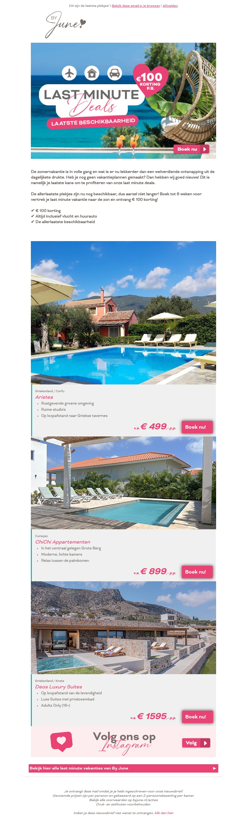 De zomer is in volle gang, en we hebben geweldig nieuws voor je vakantieplannen! Profiteer nu van onze laatste minute deals met €100 korting per persoon. Wacht niet langer en boek je ontspannen vakantie met een huurauto inbegrepen. Kies uit de laatste beschikbaarheid voor een onvergetelijke vakantie.