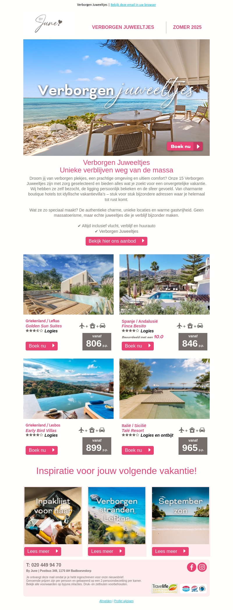 Droom weg bij By June’s zorgvuldig geselecteerde verborgen juweeltjes voor Zomer 2025. Ontdek authentieke charme, unieke locaties, en warme gastvrijheid. Deze juweeltjes garanderen een onvergetelijke vakantie, weg van massatoerisme. Boek een verblijf in prachtige omgevingen zoals Griekenland en Spanje. Mis deze unieke kans niet voor uw volgende avontuur.