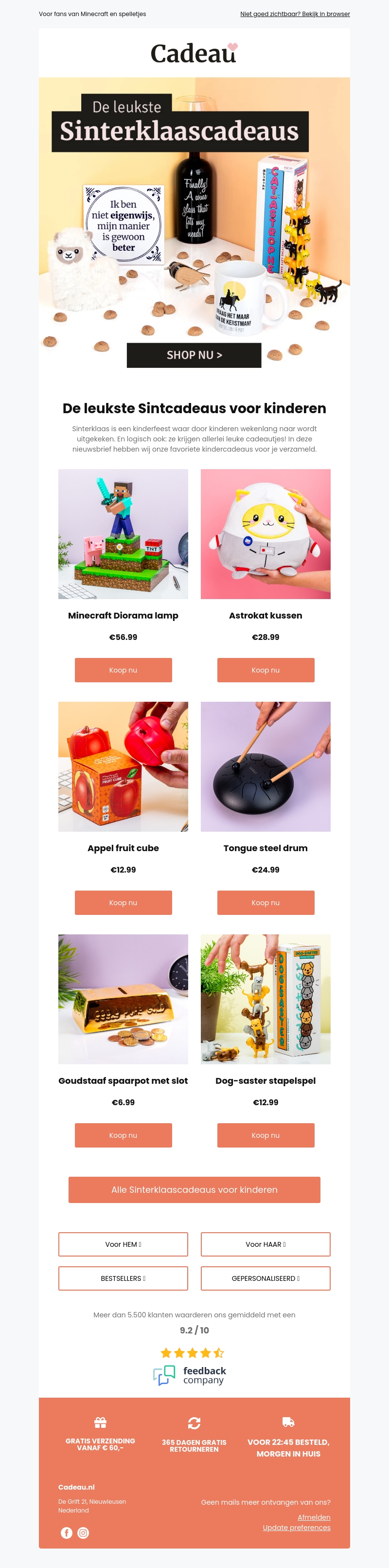 Sinterklaas komt eraan en het is tijd om te denken aan cadeaus! Ontdek in deze nieuwsbrief de leukste Sinterklaascadeaus voor kinderen. Van een Minecraft Diorama lamp tot een schattige astrokattentas, er is voor ieder wat wils. Laat je inspireren door onze creatieve cadeau-ideeën. Perfect voor de feestdagen en om elk kind te verrassen. Lees verder voor meer details over ieder item.