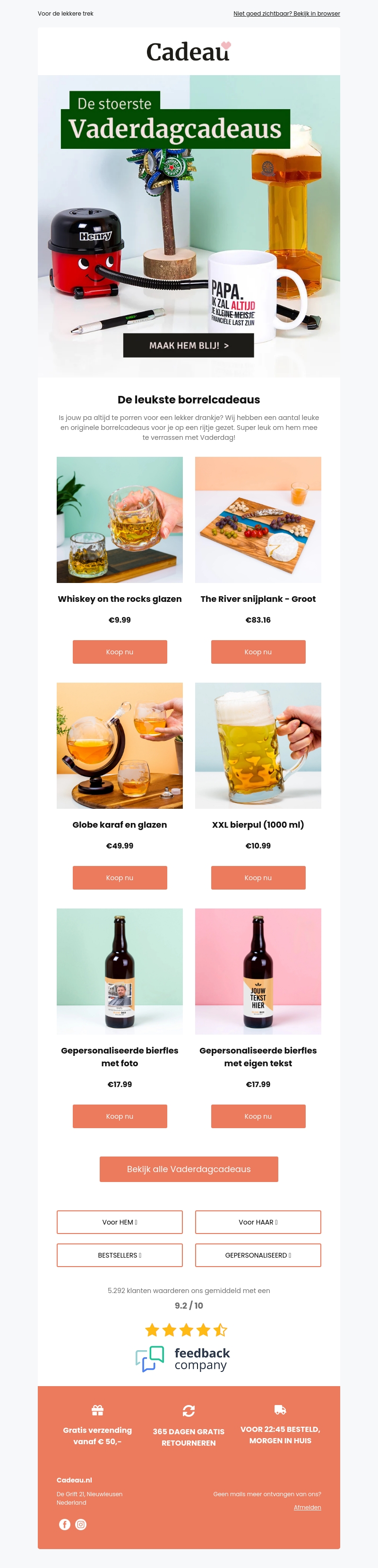 Op zoek naar een stoer cadeau voor Vaderdag? Wij hebben de leukste en meest originele borrelcadeaus verzameld om je vader te verrassen. Van gepersonaliseerde bierflessen tot stijlvolle glazen sets, bekijk onze topkeuzes!