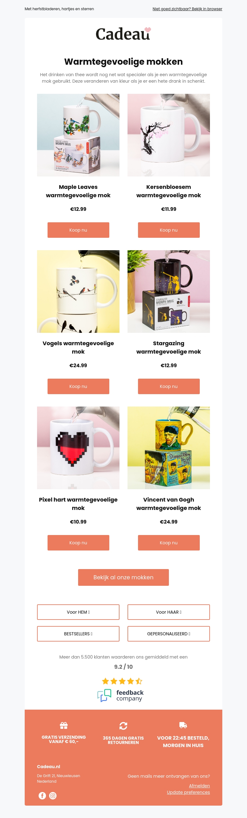 Breng jouw thee-ervaring naar een nieuw niveau met onze warmtegevoelige mokken. Elke mok verandert van kleur wanneer er een hete drank in wordt geschonken. Van herfstbladeren tot sterrenhemel, wij hebben voor ieder wat wils. Begin de dag met een unieke verrassing en ervaar zelf het magische effect. Ontdek de vrolijke designs die jouw dag opfleuren.