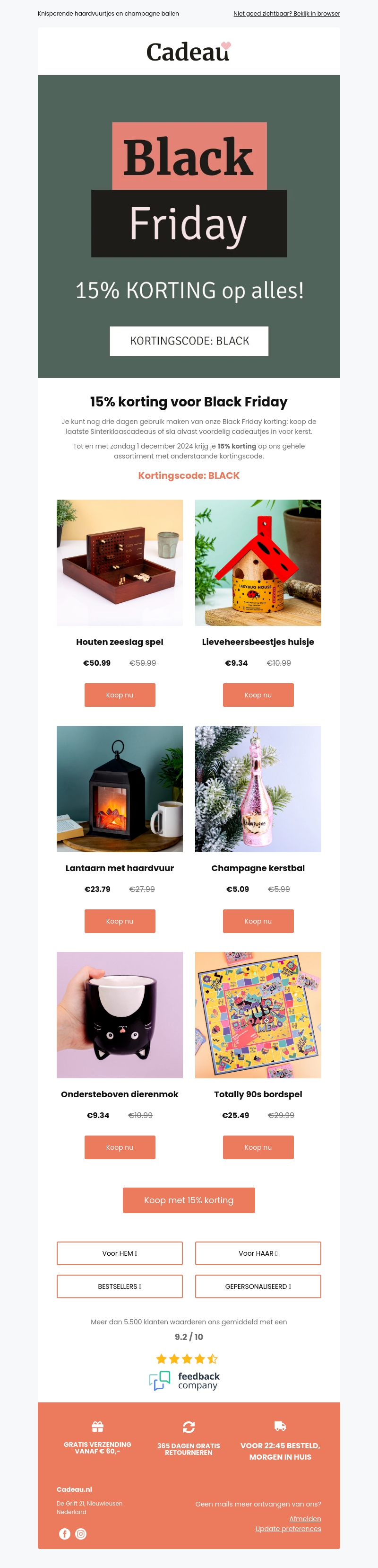 Mis deze kans niet: nog slechts drie dagen Black Friday korting bij Cadeau.nl. Ontvang 15% korting op het hele assortiment met de kortingscode BLACK. Perfecte gelegenheid om de leukste cadeaus voor de feestdagen te kopen. Van houten zeevrachtspel tot een charmante kerstbal, shop nu en bespaar.
